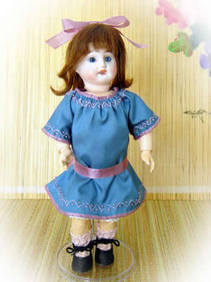Model: ? Note: Dress in teal blue silk trimmed with embroidery and ribbon. |