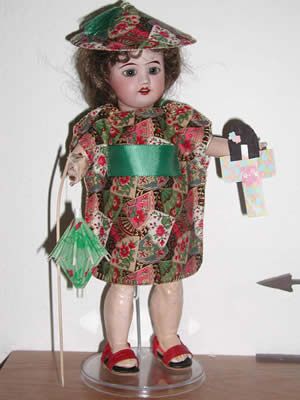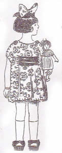 Model: Sandrine, an antique Maman: Vicki C Seamstress: Vicki C Photo belongs to Vicki C Note: The hat is made from cardstock covered with matching fabric and edged with the same gold thread used to buttonhole stitch around the garment. The hat tassel is made of the same green ribbon as is used for the ribbon belt. |