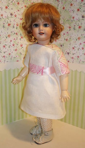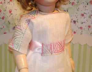 Model: Amelie Maman: Francie Harville Seamstress: Francie Harville Photo belongs to Francie Harville Note: I made it from Italian handkerchief linen, embroidered with hand-dyed silk floss, but machine-sewn. I used a silk ribbon for the sash. |