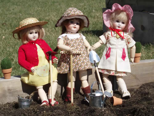 Models (left to right): Jeanette, Amilia, and Noelle Maman: Christine Bridy Seamstress: Christine Bridy Left: 1947 #37 Center: 1927 #24 Right: 1939 #39 Photo belongs to Christine Bridy Garden tools available from Christine Bridy |